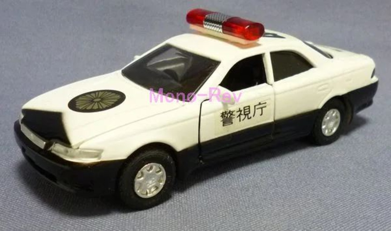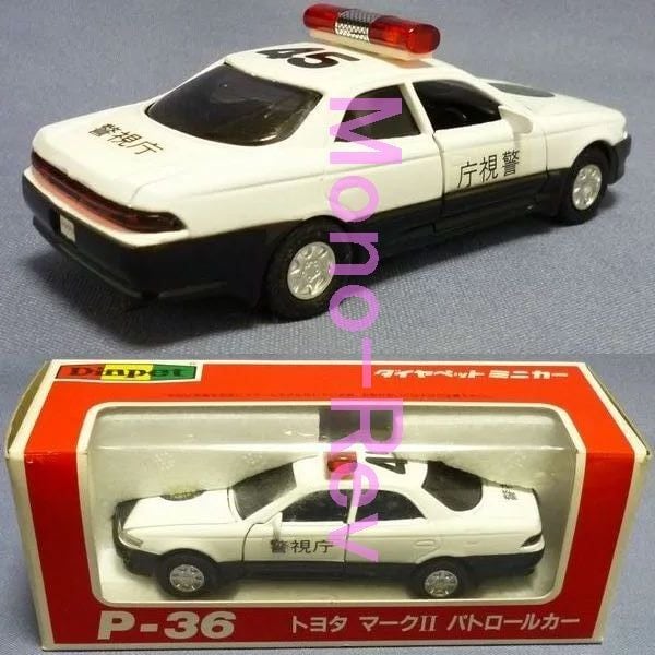 ダイヤペットP-36 トヨタ マークII パトカー (JZX90)、1994年頃の製造品です。モデルは1992年JZX90初期型をベースに、車体色を白/黒に塗り分けたパトロールカー仕様にしています。スケール1/40(車体長さ約115m)、ボンネットなど塗装に細かなプツプツがあります。後窓に成型時の気泡が見えます。フタ破れありの箱付。良くまとまった出来です。