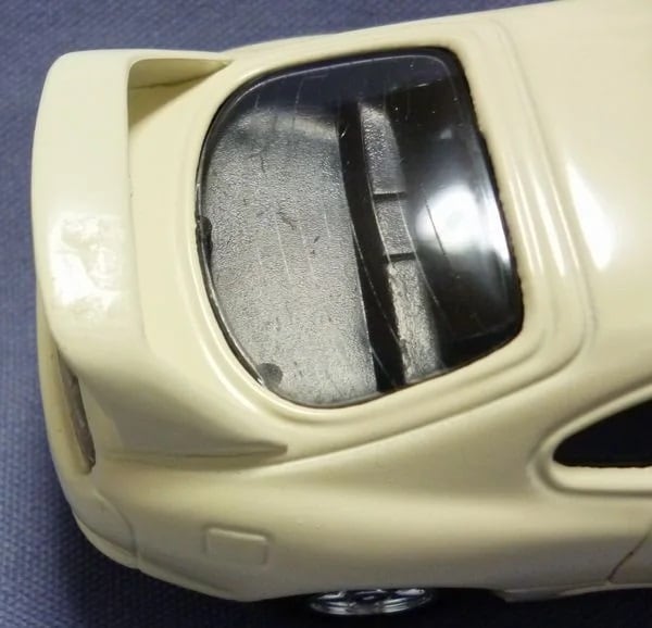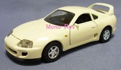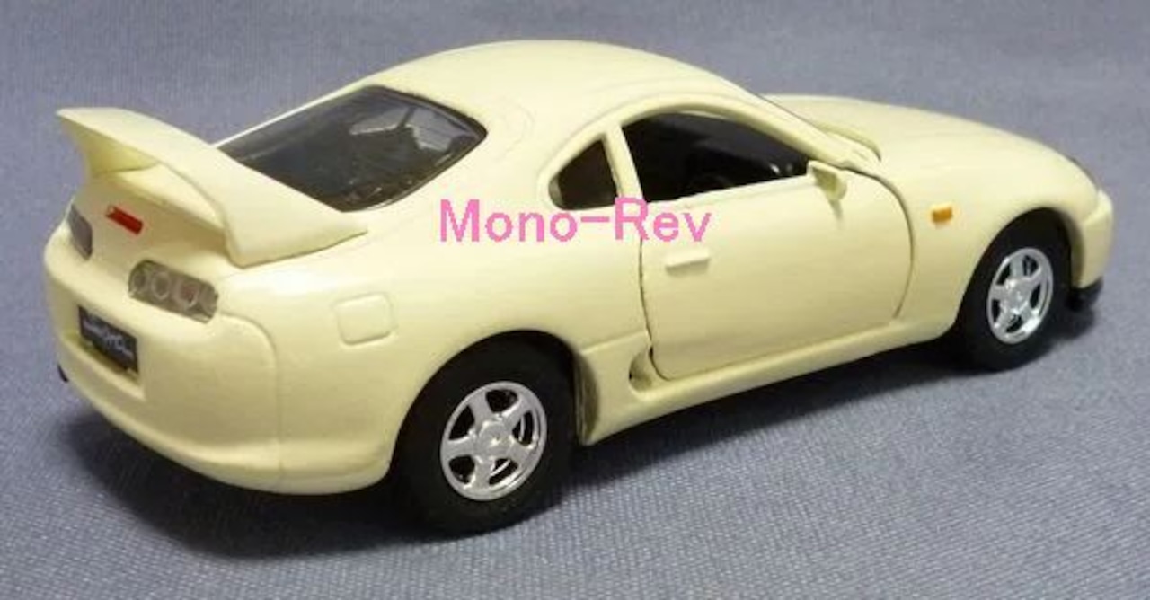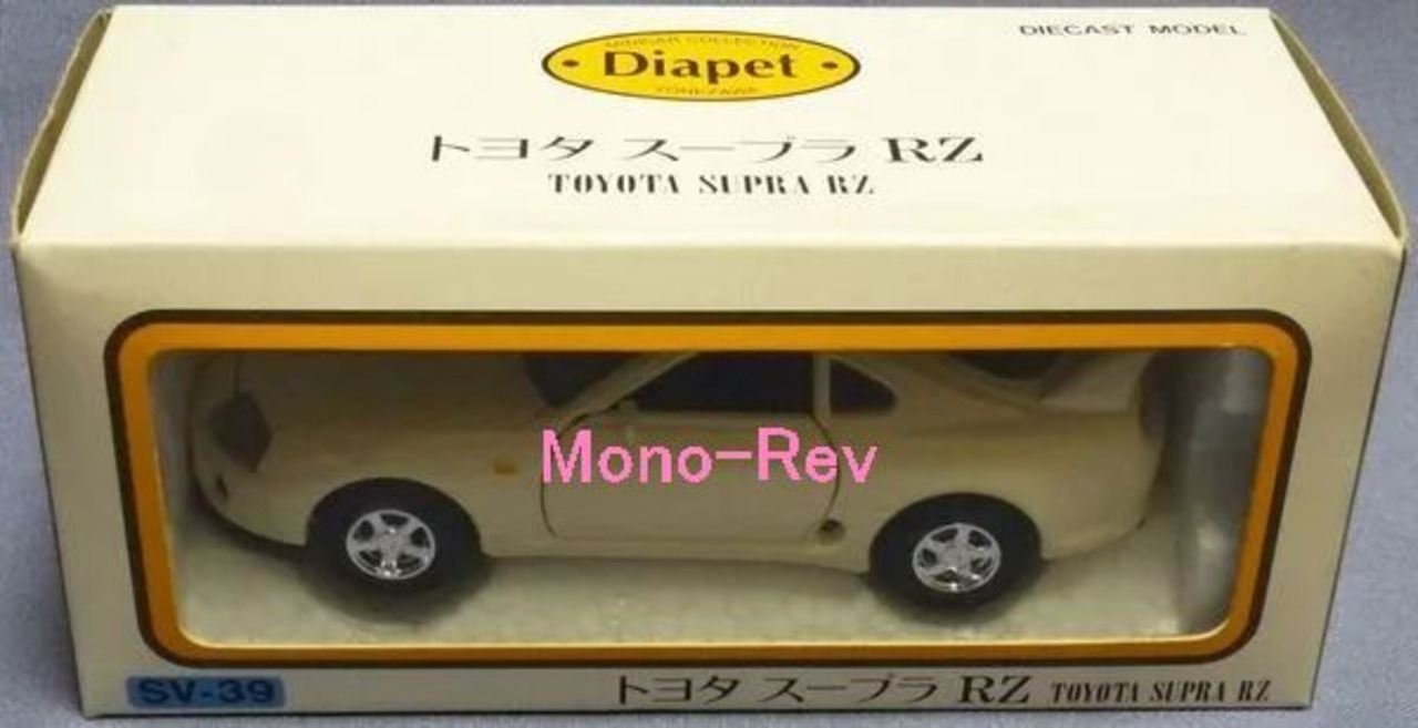 ダイヤペットSV-39 トヨタ スープラ、1996年製造品、日本製です。モデルは80スープラ、車体色:アイボリーホワイトです。リヤスポイラーの塗装がが発泡スチロールと反応しており3枚目画像のようになっております。また左右前フェンダーのターンシグナルライト部に黄色、ドアミラーに銀色、リヤハイマウントストップランプ部に赤のテープのようなもので色入れがあります。スケール1/40(車体長さ約110m)、箱付きです。SG品番変更寸前の製品です。