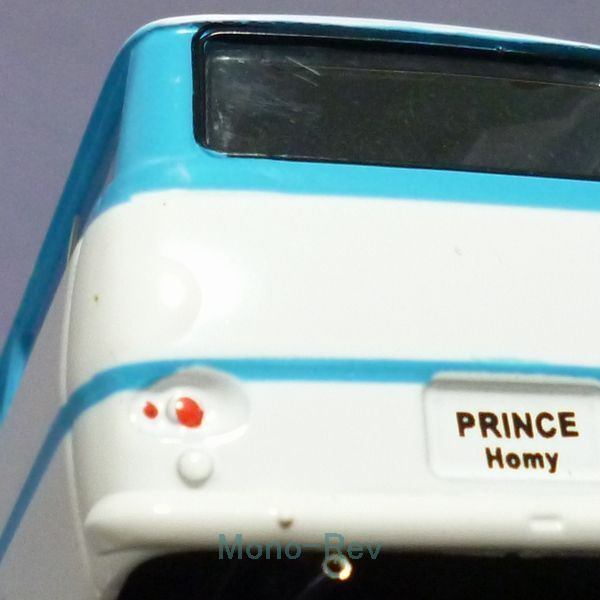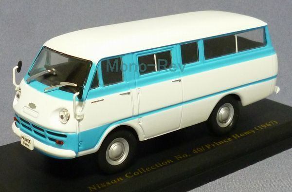 プリンス ホーマーバンの15人乗りマイクロバス仕様「ホーミー」で、日産と合併後の1966年8月以降の1967年型車をモデル化しているものと思われます。ヘッドレスト、フロントのエンブレムマークは1968年マイナーチェンジ車風になっているのはご愛嬌。ミラーはプリンス時代は丸型と言われていますが、過渡期のモデルなので67年発売車に楕円ミラーが付いているものもカタログ写真にあります。