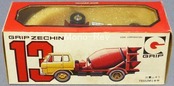 グリップゼッケン13 三菱ふそう T653ZM ミキサ 日本製です。表示スケール:1/70(車体全長:ホッパー後端部までで約90mm)、黄色キャブに小傷あります。その他若干の擦れがあります。箱付き、株式会社永大が1974年7月から発売した製品です。