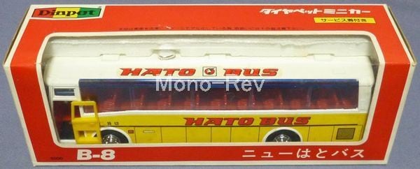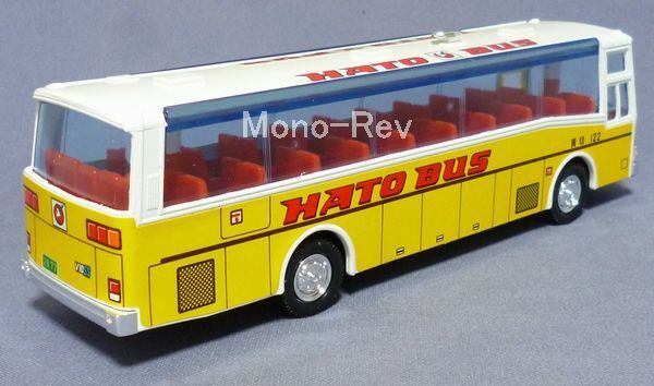 ダイヤペットB-8 ニュー JR ハイウェイバス(三菱P-MS735SA)をベースにしたはとバス、1991年の日本製です。スケール1/60(車体長さ約200mm)、左の前ドア開閉機構つき。車体カラー:白(側面などのカラーリングはすべてシール貼りによるもの)、屋根のHATOBUS左側シールに若干の退色がございます。パッケージ付き。